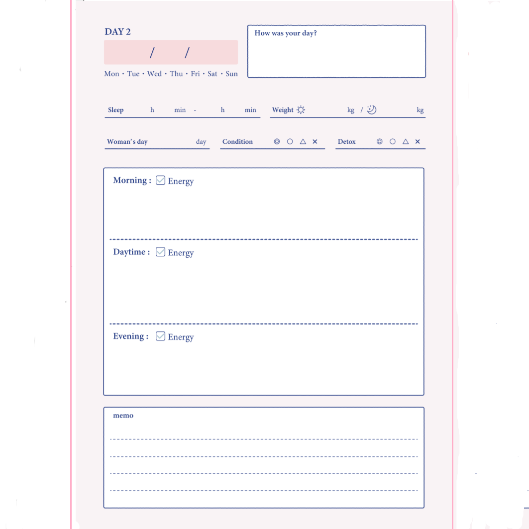 睡眠時間、体調、体重記録などを書き込めます。